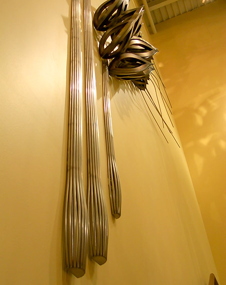 Whole Wheat was commissioned for a new Whole Foods Market flagship store in Washington, DC. The stainless steel stalks begin on the wall close to the main entrance, and grow 25 feet to the natural-finished steel heads of wheat by the second floor entrance. Individual grains suspended above the stairwell appear to be carried off on the wind.